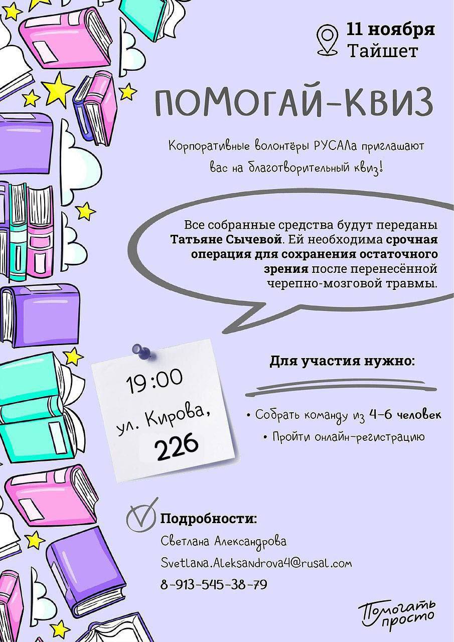 Корпоративные волонтёры РУСАЛа приглашают команды Тайшета на городскую благотворительную игру «Помогай-квиз»! Это отличный повод собраться с друзьями или коллегами, помериться эрудицией и сделать доброе дело 💫 📅 11 ноября, 19:00 📍 ул. Кирова, 226 (Планета) 👥 Собери команду мечты! — От 4 до 6 участников — Зарегистрируйтесь онлайн до 8 ноября 👉 форма