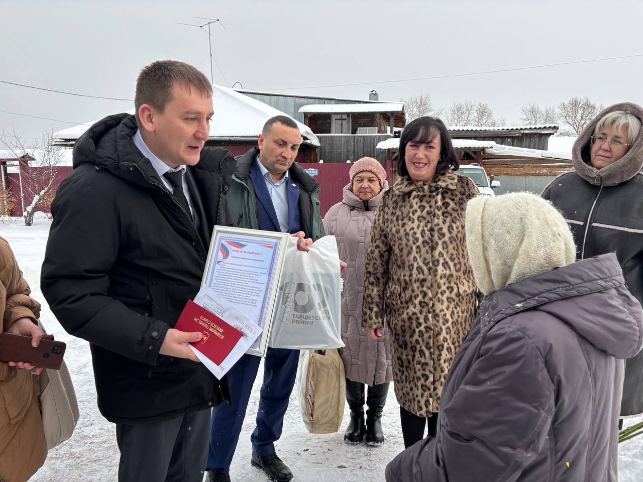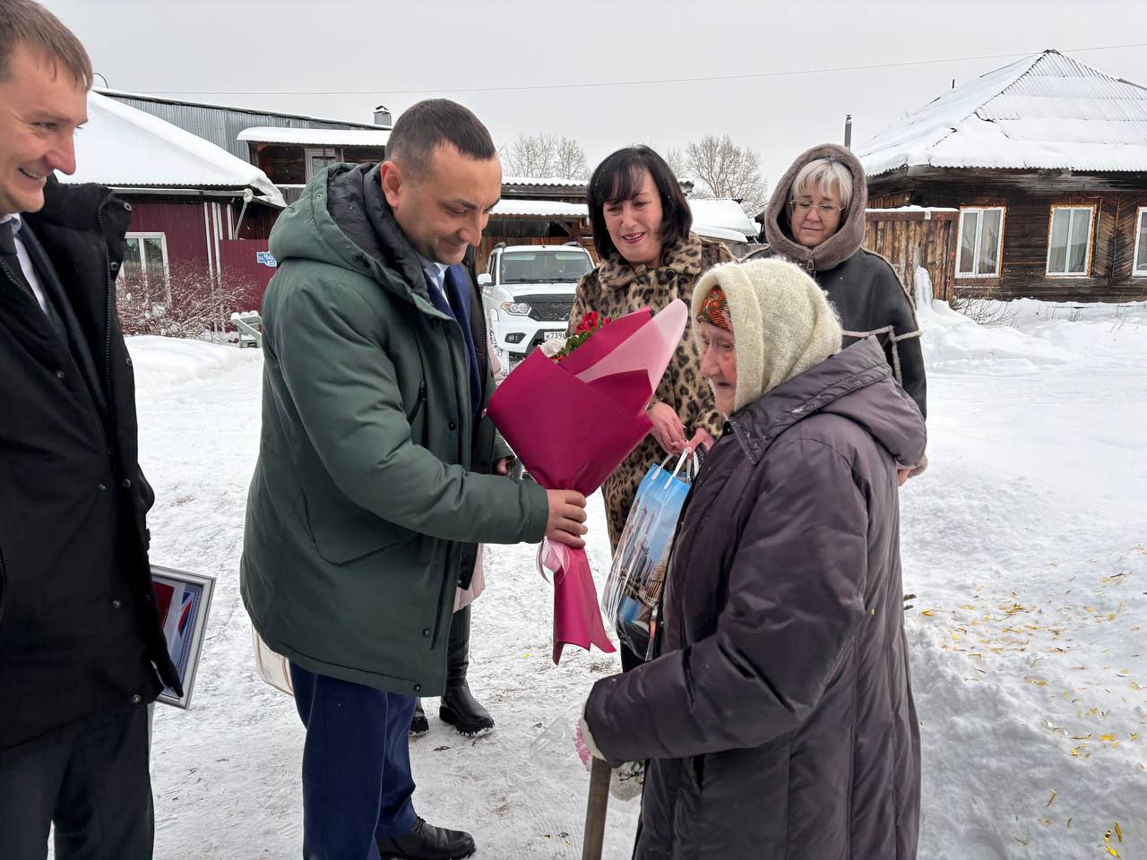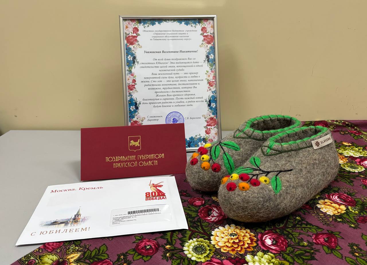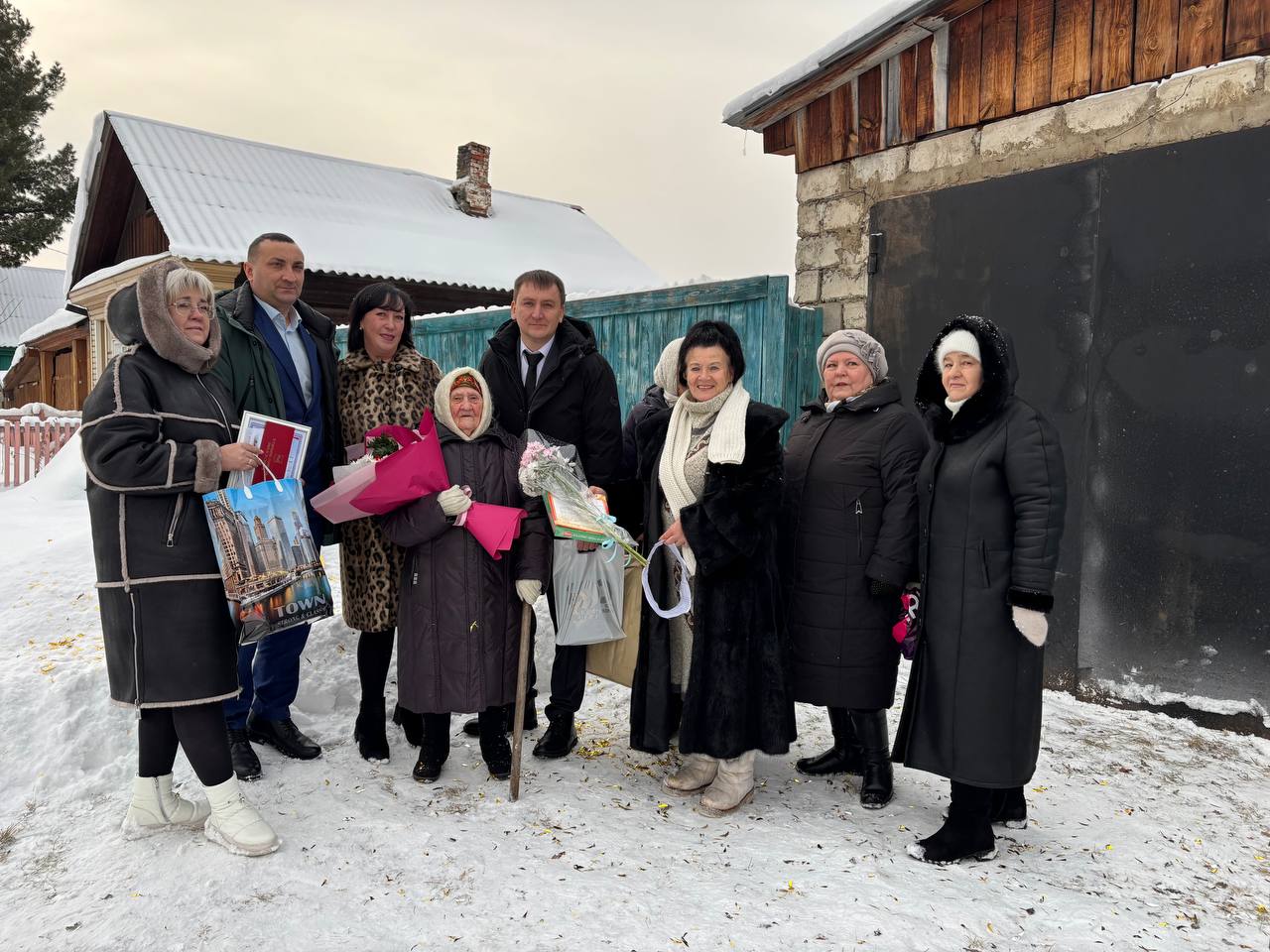 Первый заместитель главы Тайшетского городского поселения Леоненко Руслан Олегович, заместитель мэра Тайшетского муниципального округа по социальным вопросам Никулин Вячеслав Владимирович, директор Управления социальной защиты и социального обслуживания населения по Тайшетскому муниципальному округу Береснева Светлана Владимировна совместно с представителями городского Совета ветеранов побывали в гостях у именинницы. Они поздравили Валентину Никитичну с Юбилеем, пожелали ей крепкого здоровья, благополучия и хорошего настроения. Юбиляру вручили персональное поздравление Президента Российской Федерации, поздравительный адрес от Губернатора Иркутской области Игоря Ивановича Кобзева и подарки от гостей.