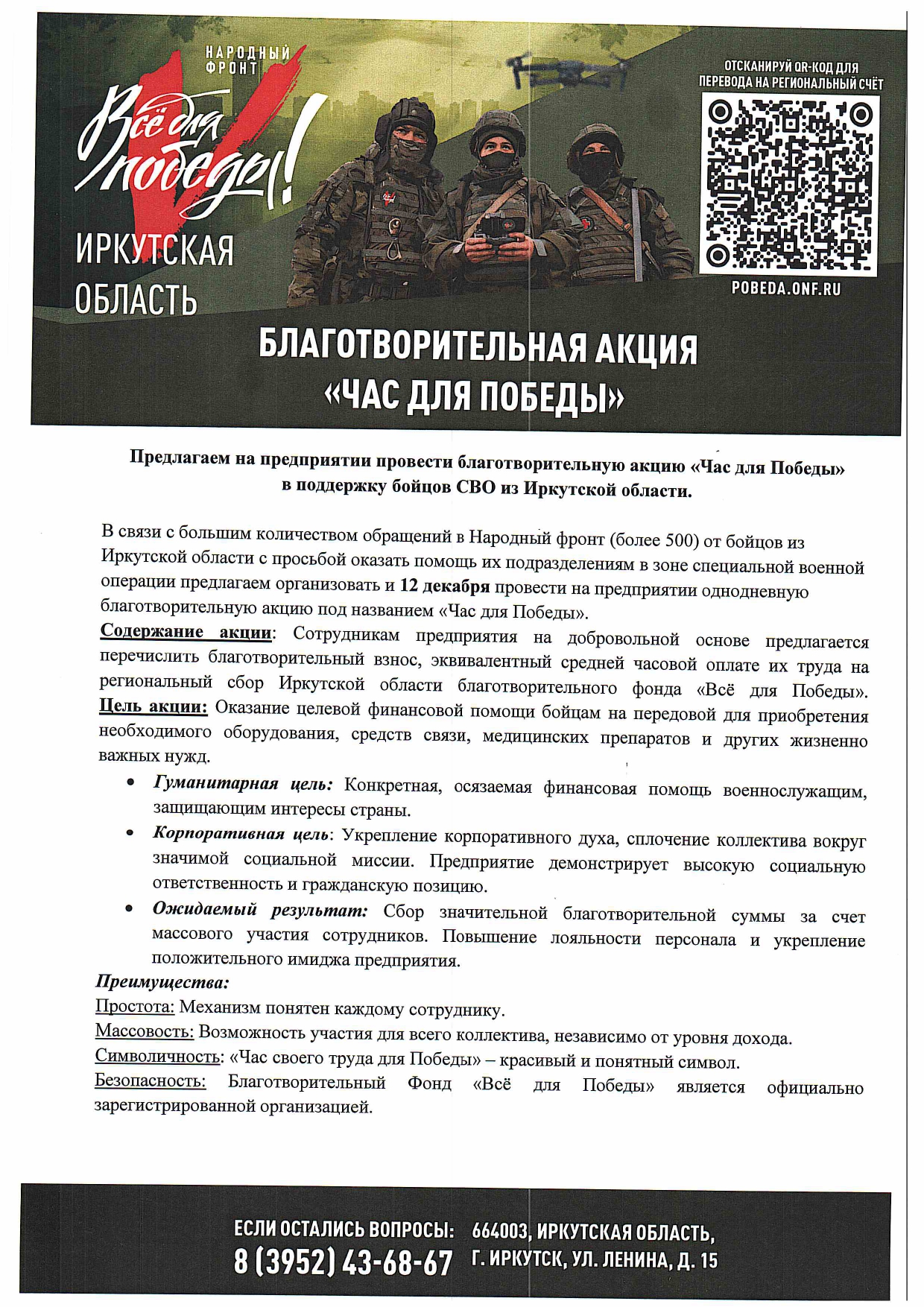 Акция «Час для Победы», организованная Общероссийским общественным движением «НАРОДНЫЙ ФРОНТ «ЗА РОССИЮ», предусматривает возможность добровольного перечисления денежных средств в размере, эквивалентном стоимости одного рабочего часа, для поддержки военнослужащих, находящихся в зоне специальной военной операции. 12 декабря 2025 года Благотворительный фонд «Народный фронт. Всё для Победы!» проводит однодневный сбор средств для помощи бойцам СВО из Читать далее…